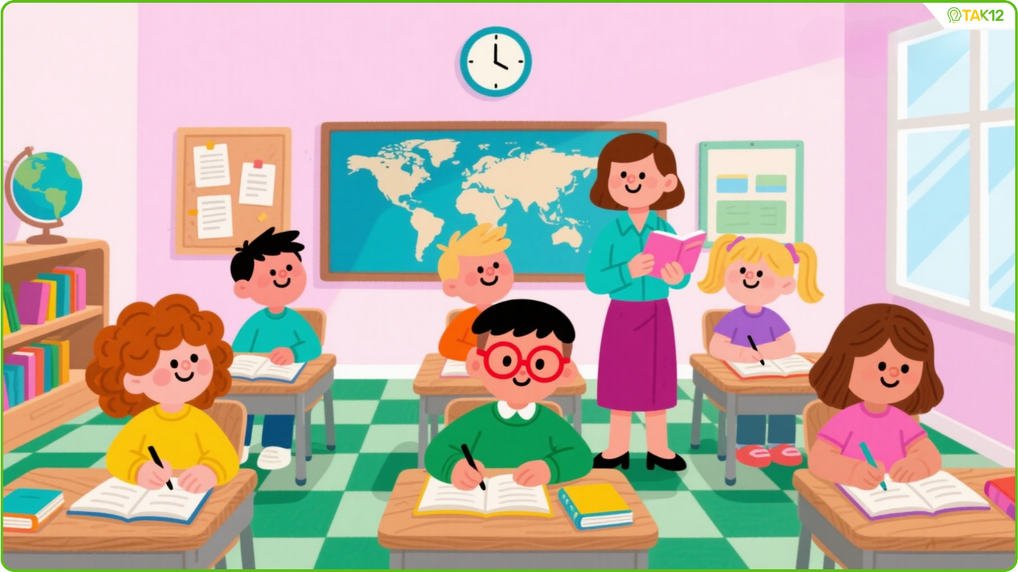 4. The teacher is wearing a yellow skirt.