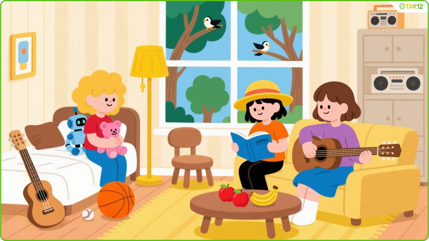 3. The girl in a yellow hat is reading a book.