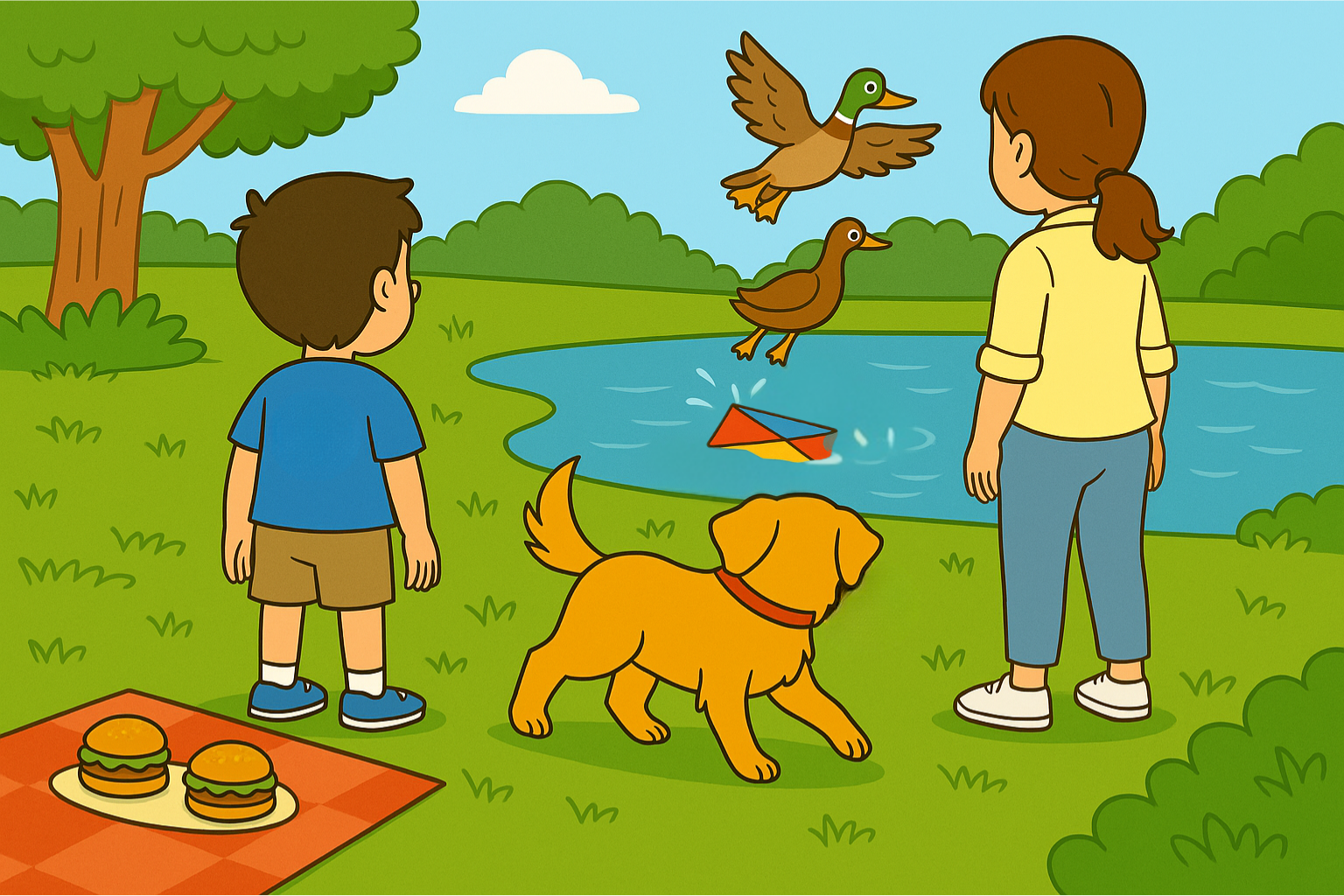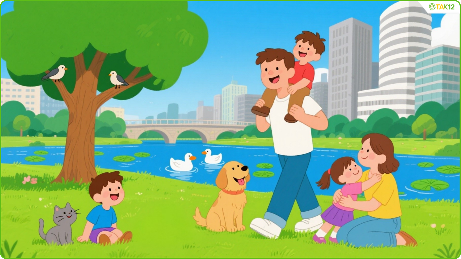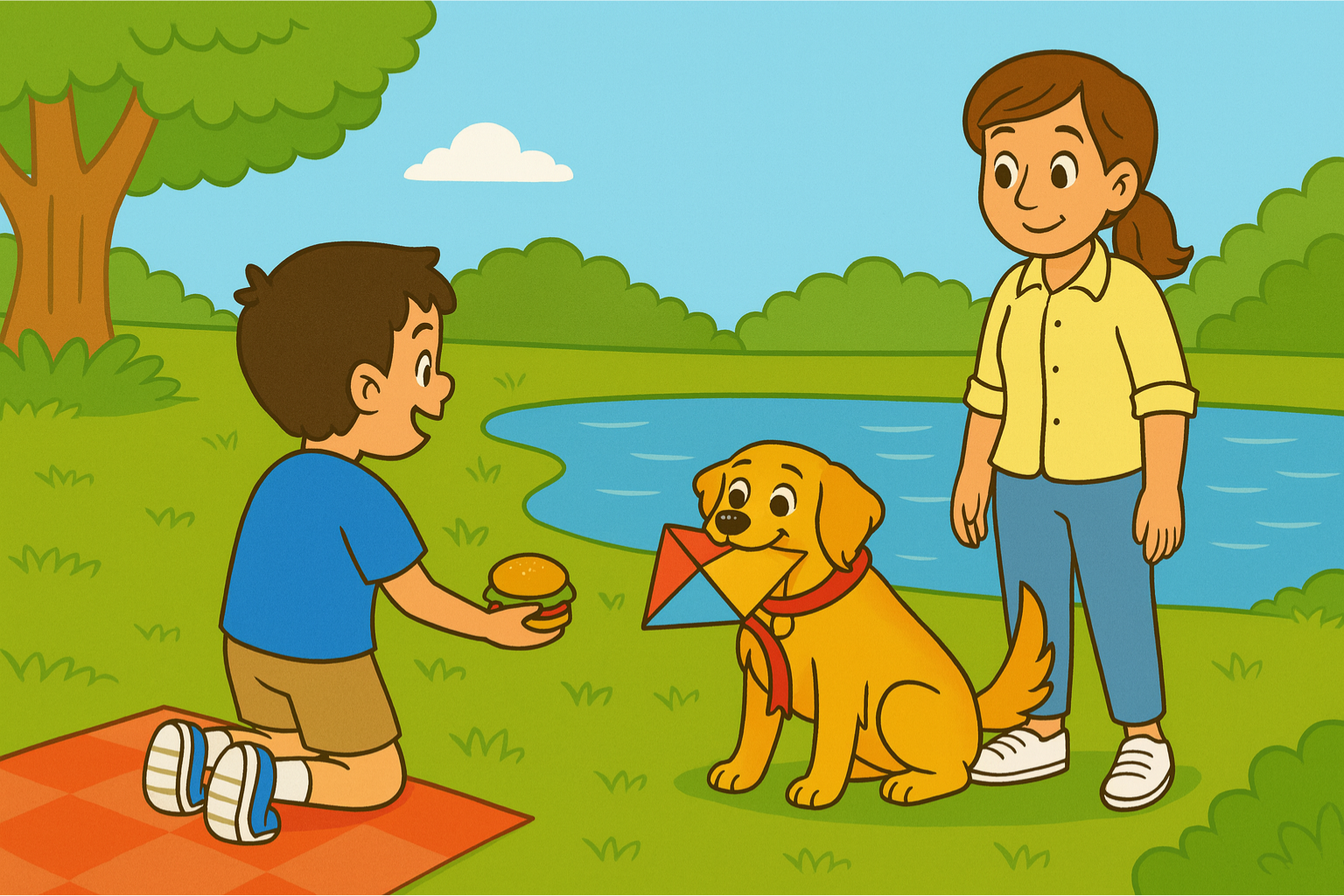 Grace has got a garden behind her house. There is a big tree in her garden. Grace can see some animals. There is a small under the tree. It is playing with a ball. Some birds and a live in the tree. She can give the birds some . There are many flowers next to the tree. Some are on the flowers. Grace likes looking at the flowers in the . She loves her garden very much.