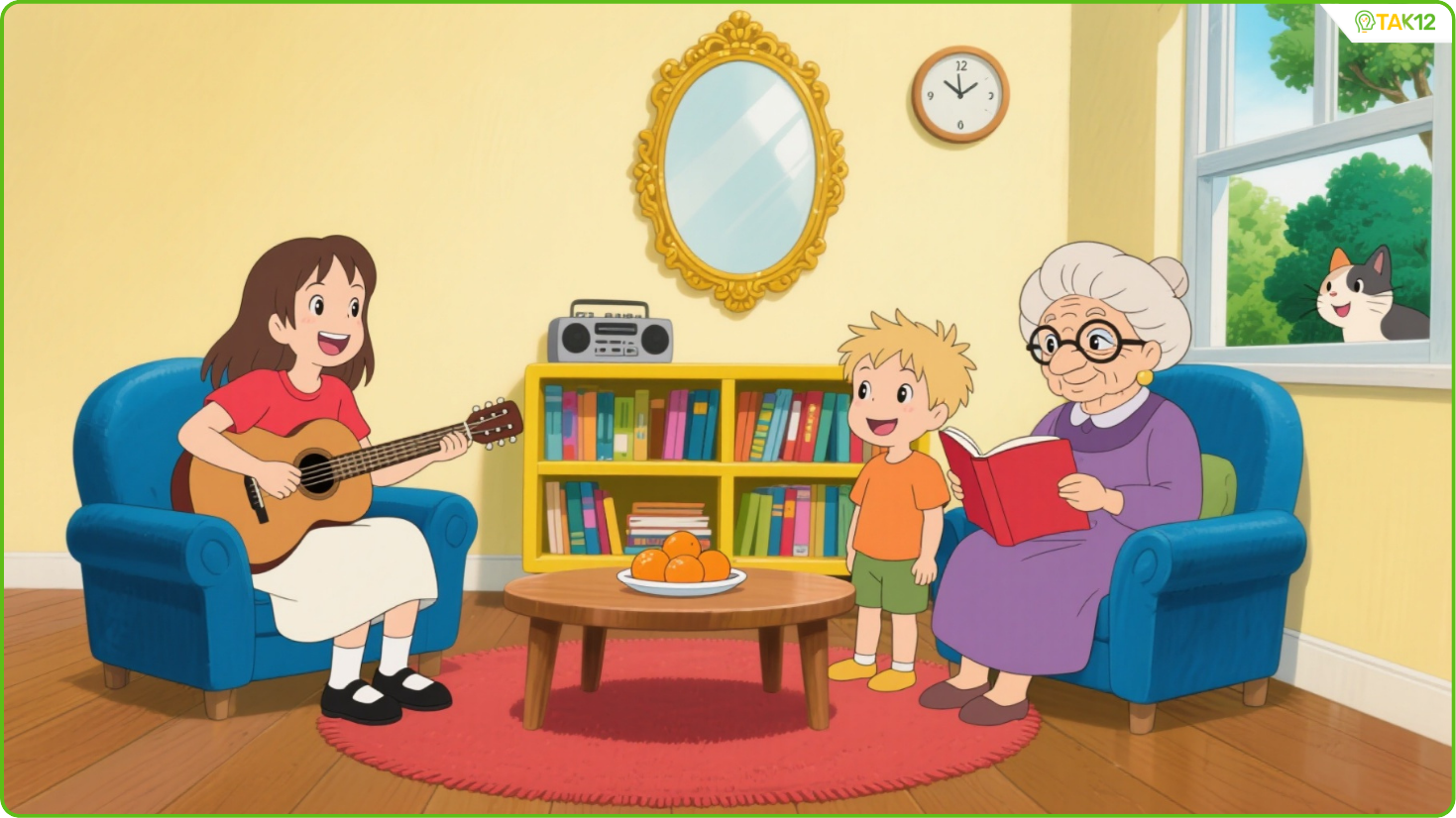Today is Kim's birthday. She is seven years old. There are many balloons in the . Kim has got a big birthday with pink flowers on it. There are many friends at her party. Kim's friends give her a nice and she wears it on her head. They play games and have lots of fun. Kim's dad gives them some . All the like the food at the party. Kim is very happy today.