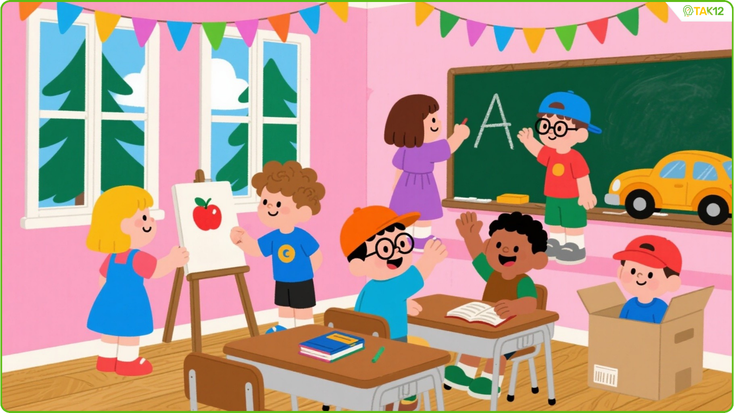 2. There is a big toy car in front of the board.