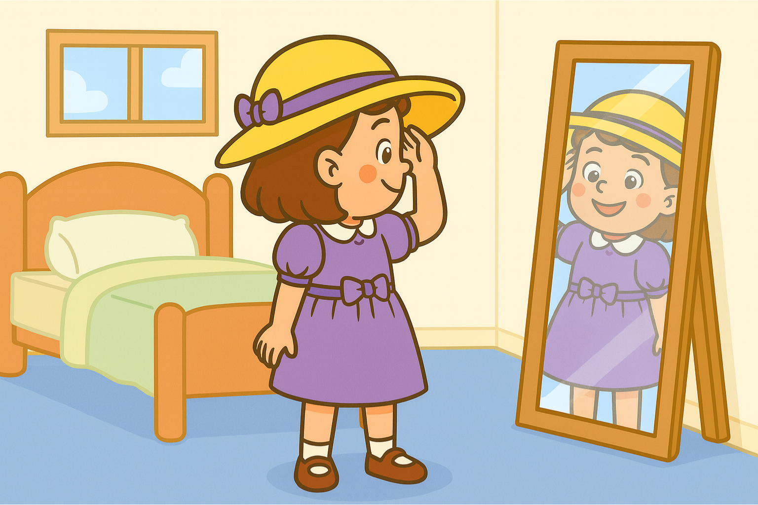 1. The girl in a purple dress is writing on the board.