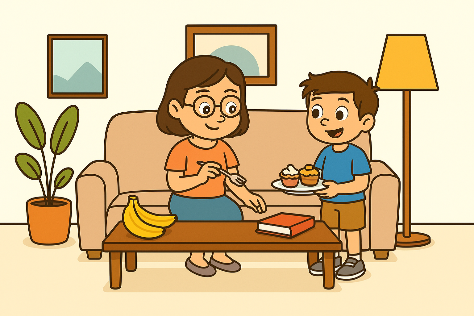 This is my cousin Alice. She lives in my street with her mum, dad and three . She likes wearing T-shirts and . We like walking to the playground and eating . Alice likes playing the guitar and singing songs. At weekends, we go or talk to our friends on the . We are happy.