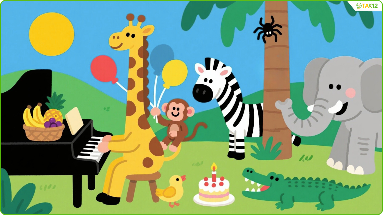 4. The cake is between the bird and the crocodile.