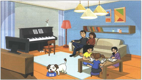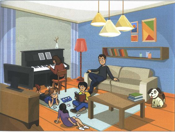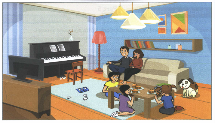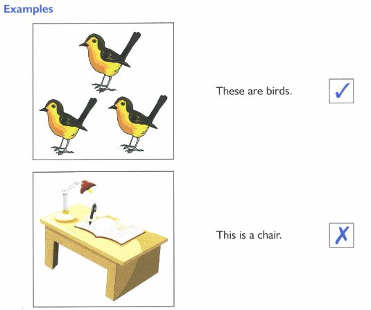 Look and read. Put a tick (V) or a cross (X) in the box. There are two examples.