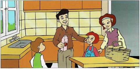 2. What has Dad got in his hand? - Apple