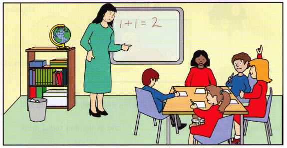 Children go to school to learn, and they have lessons in classrooms with a . There is a , a bookcase and cupboard, and some desks and chairs in a classroom. The teacher writes on the board, and the children sit at their . Some classrooms have got with keyboards and mice, too. Children learn how to read and write, but they can listen to , too. Many teachers use songs and games to teach, and that makes children really happy.