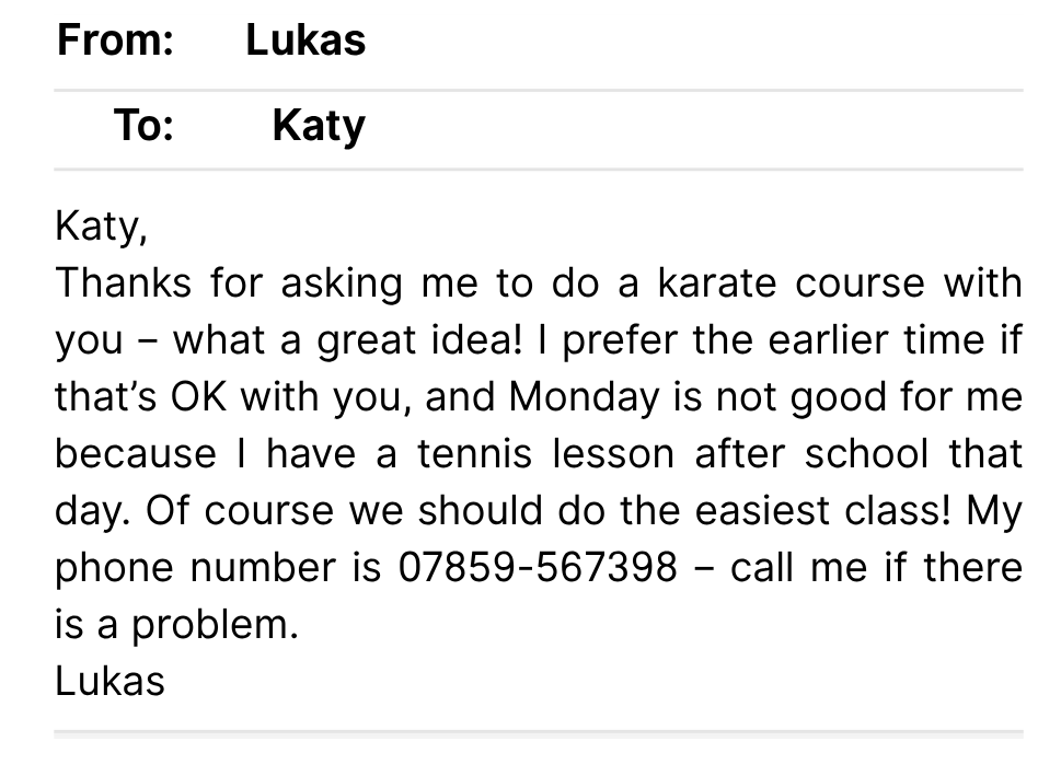 Read the note from your friend Eric. Write a note to tell him what he wants to know.