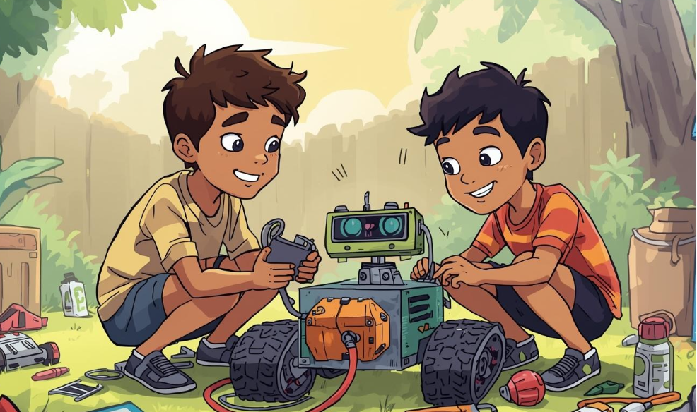 "Let's make a robot that picks up paper at school!" George said to David. "It can help keep our school clean!"