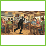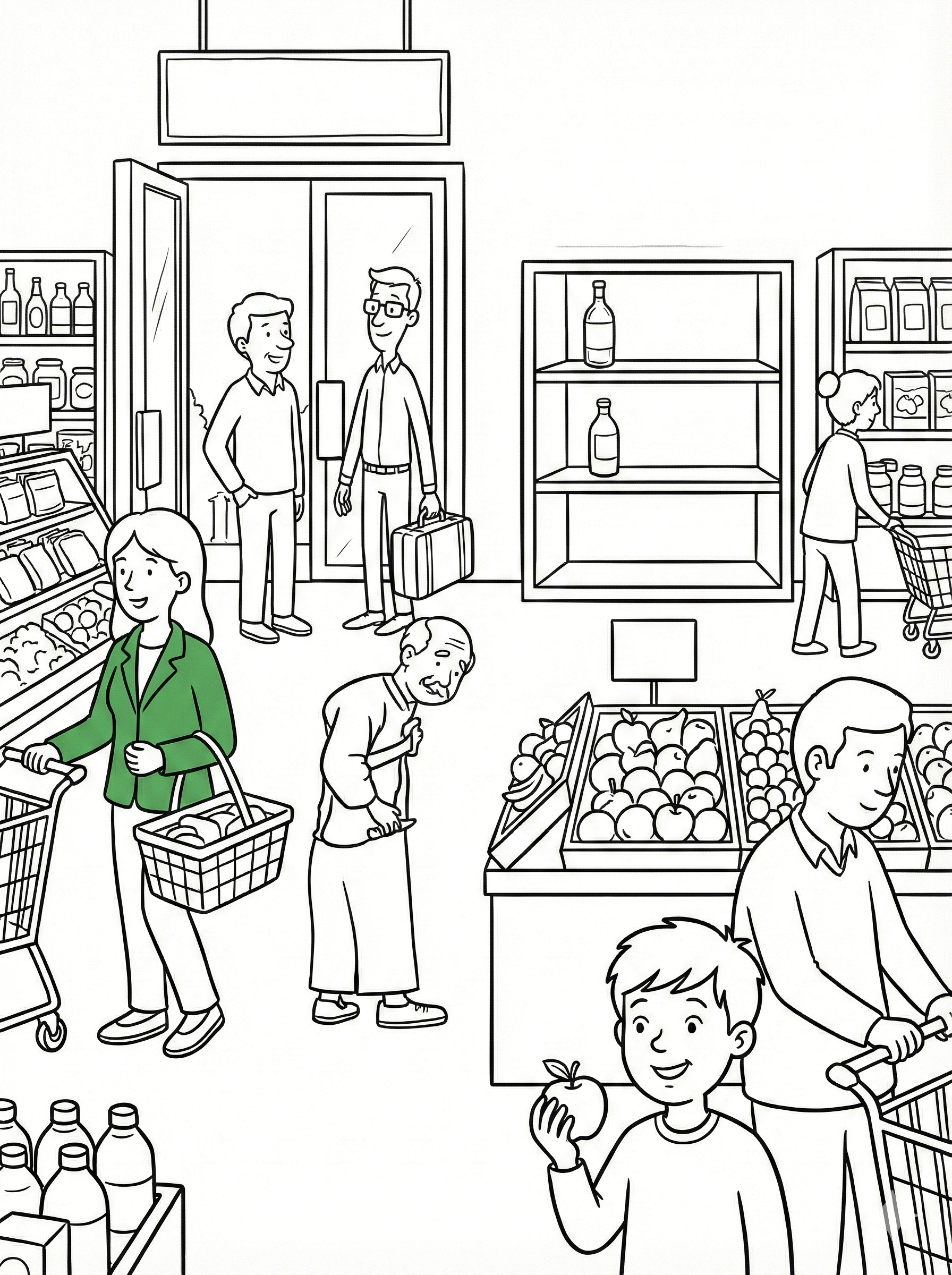 1. Colour the suitcase of the man who is wearing glasses near the entrance -