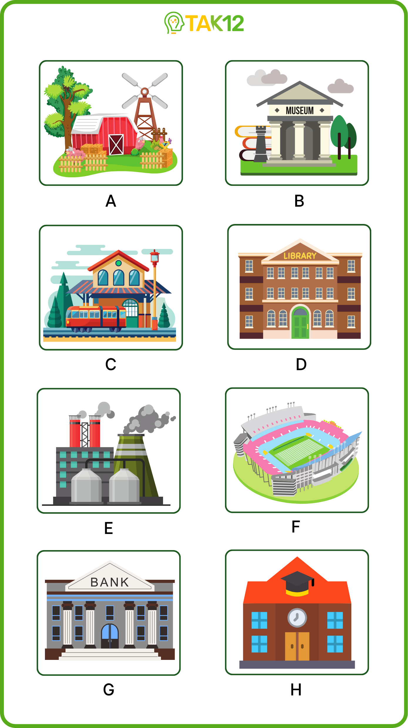 Listen and write a letter in each box. There is one example.