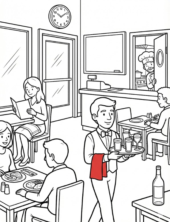 Example: Colour the towel on the waiter's arm - red