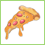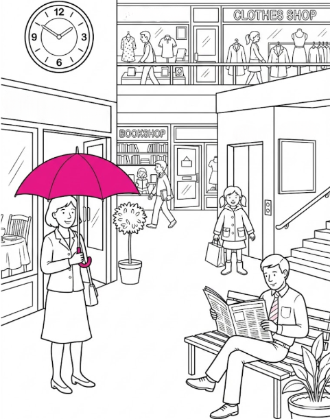 Example: Colour the umbrella of the woman who is standing outside the restaurant - pink