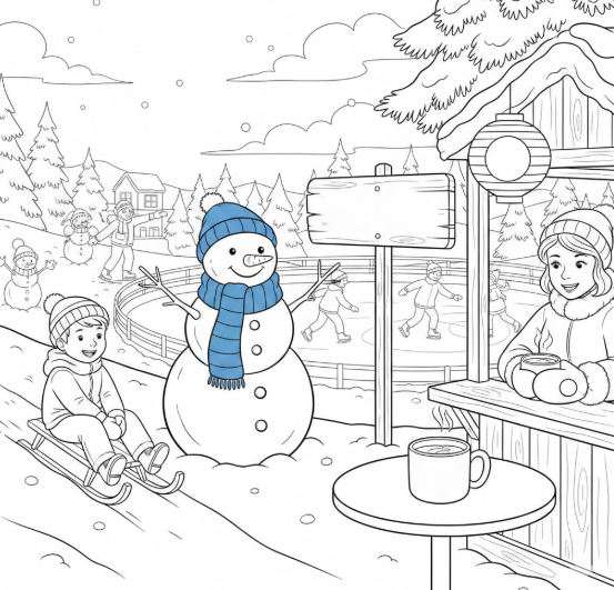 Example: Colour the scarf and hat of the big snowman in the middle - blue