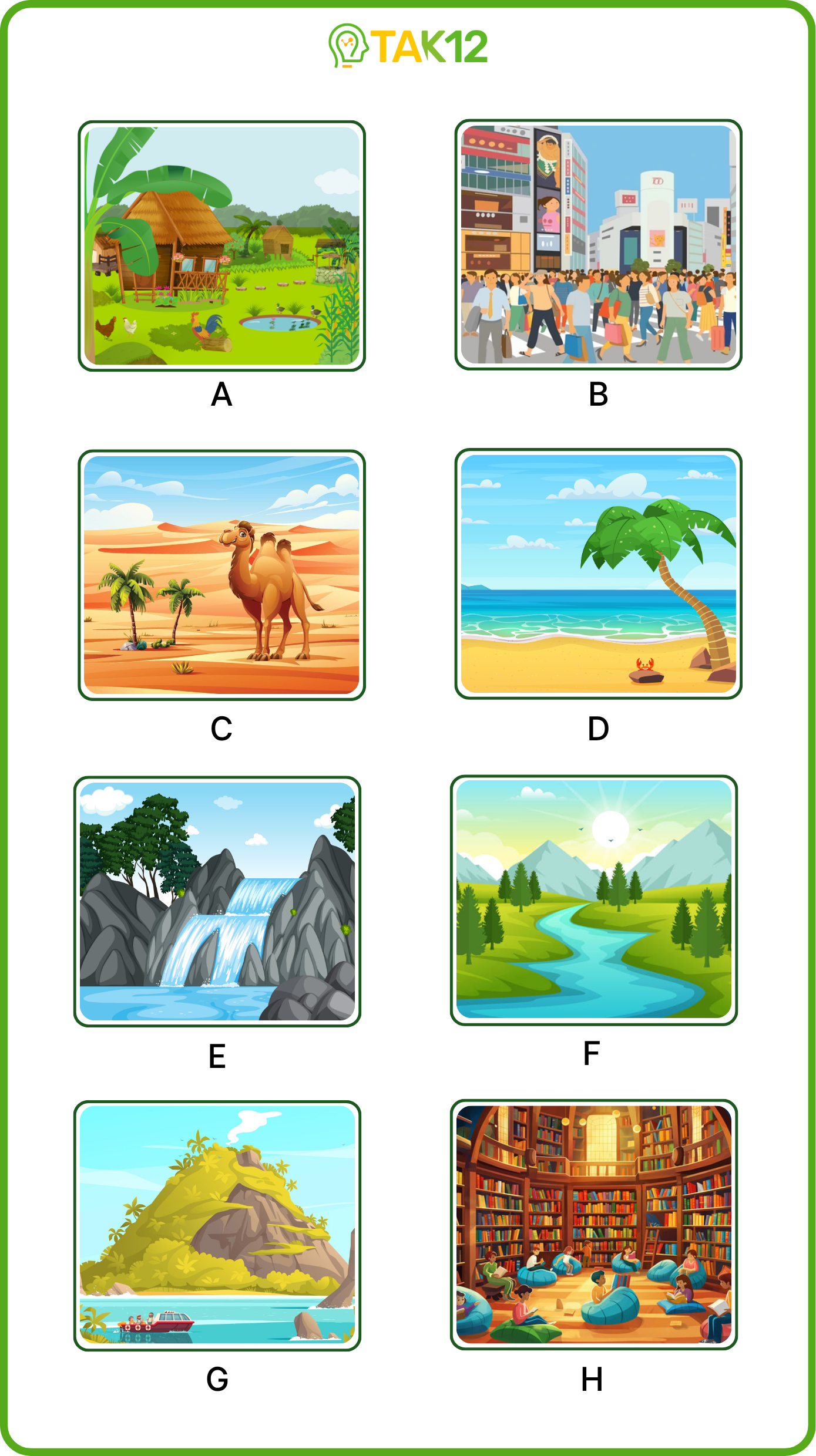 Listen and write a letter in each box. There is one example.