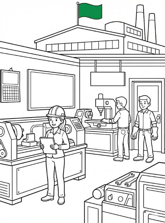1. Colour the notebook of the engineer who is standing near the machine -