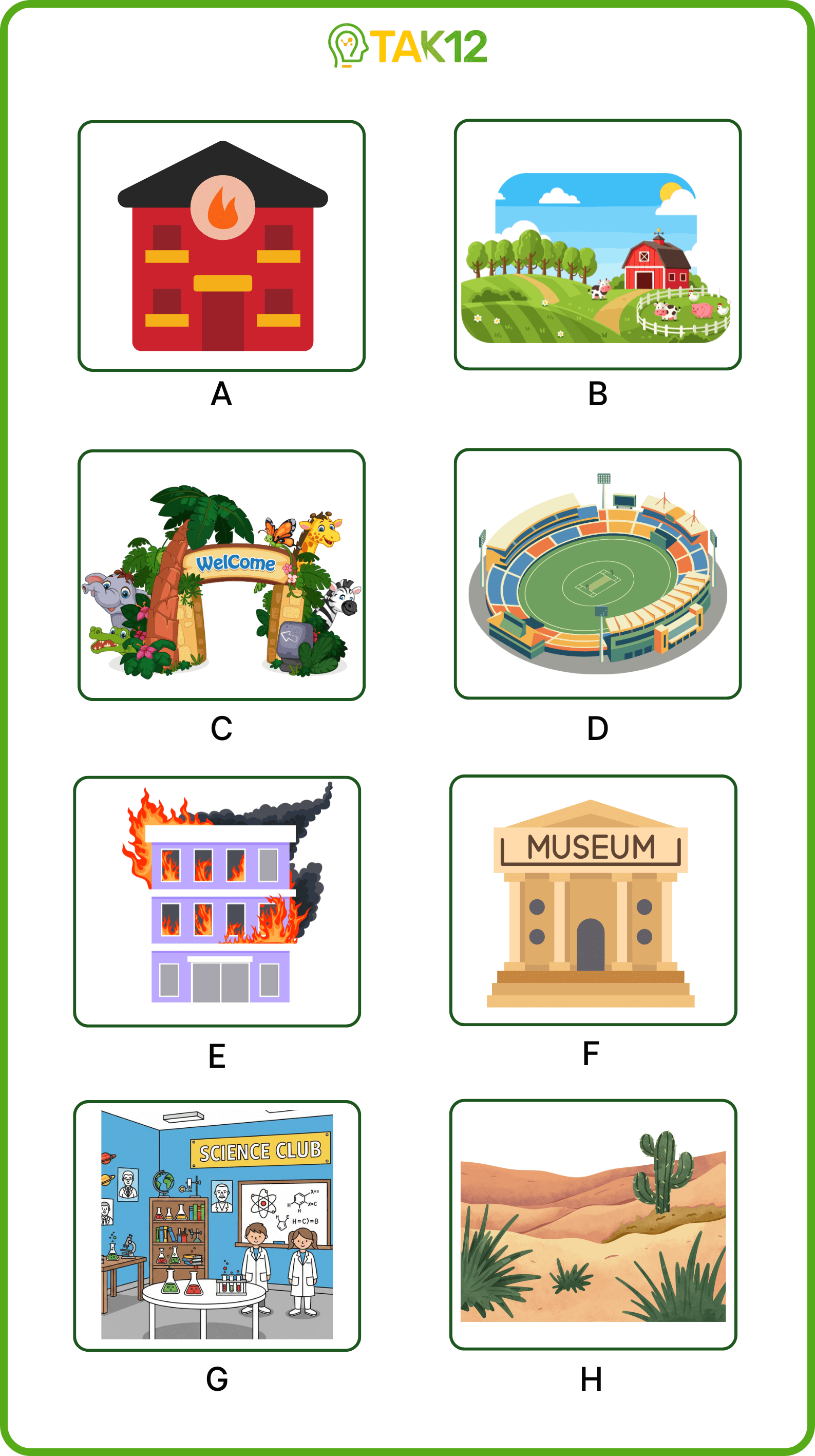 Listen and write a letter in each box. There is one example.
