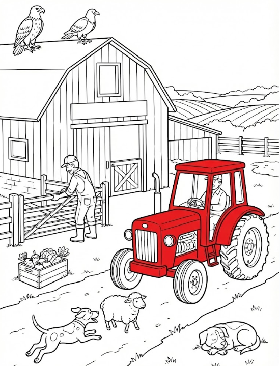 Example: Colour the tractor that the farmer is driving - red