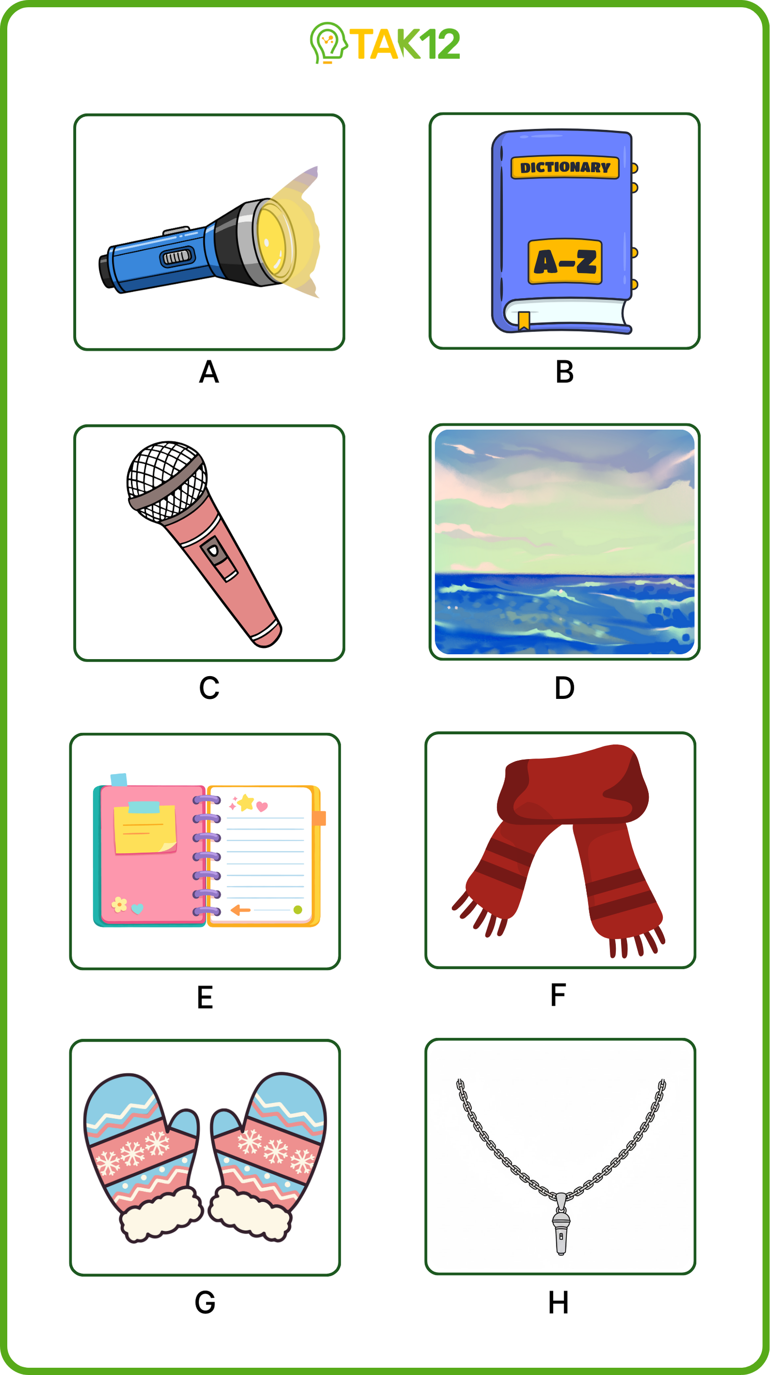 Listen and write a letter in each box. There is one example.