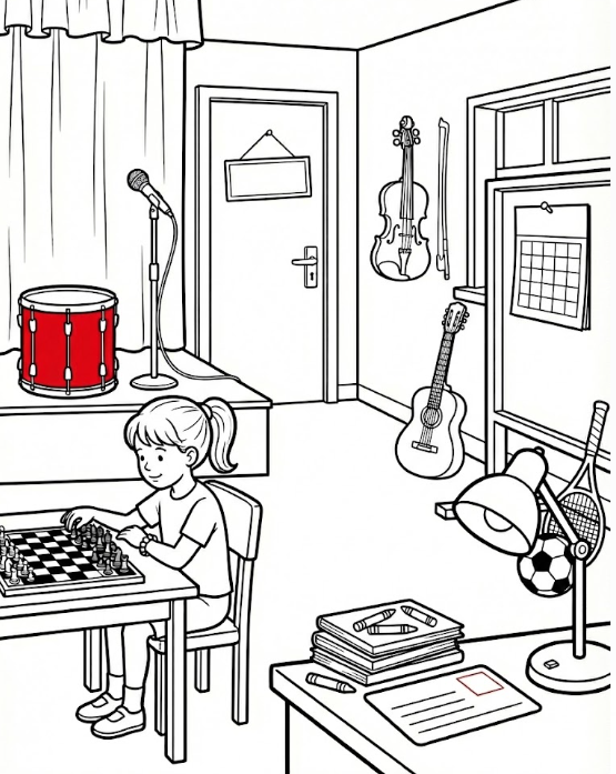 1. Colour the bracelet of the girl who is playing chess at the table -