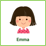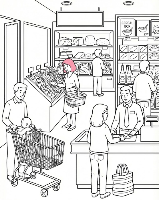 Example: Colour the hair of the woman in front of the vegetable section - pink