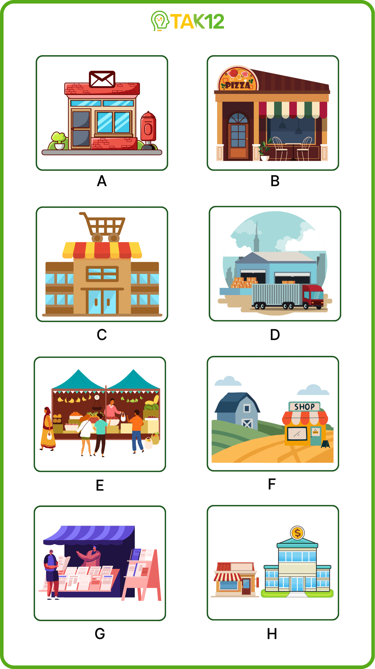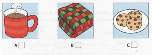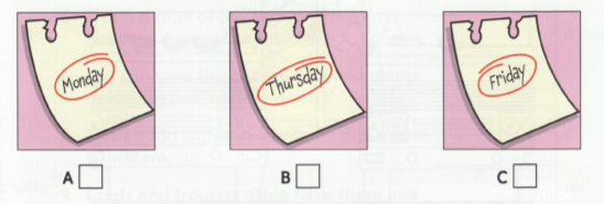 Listen and write a letter in each box. There is one example.
