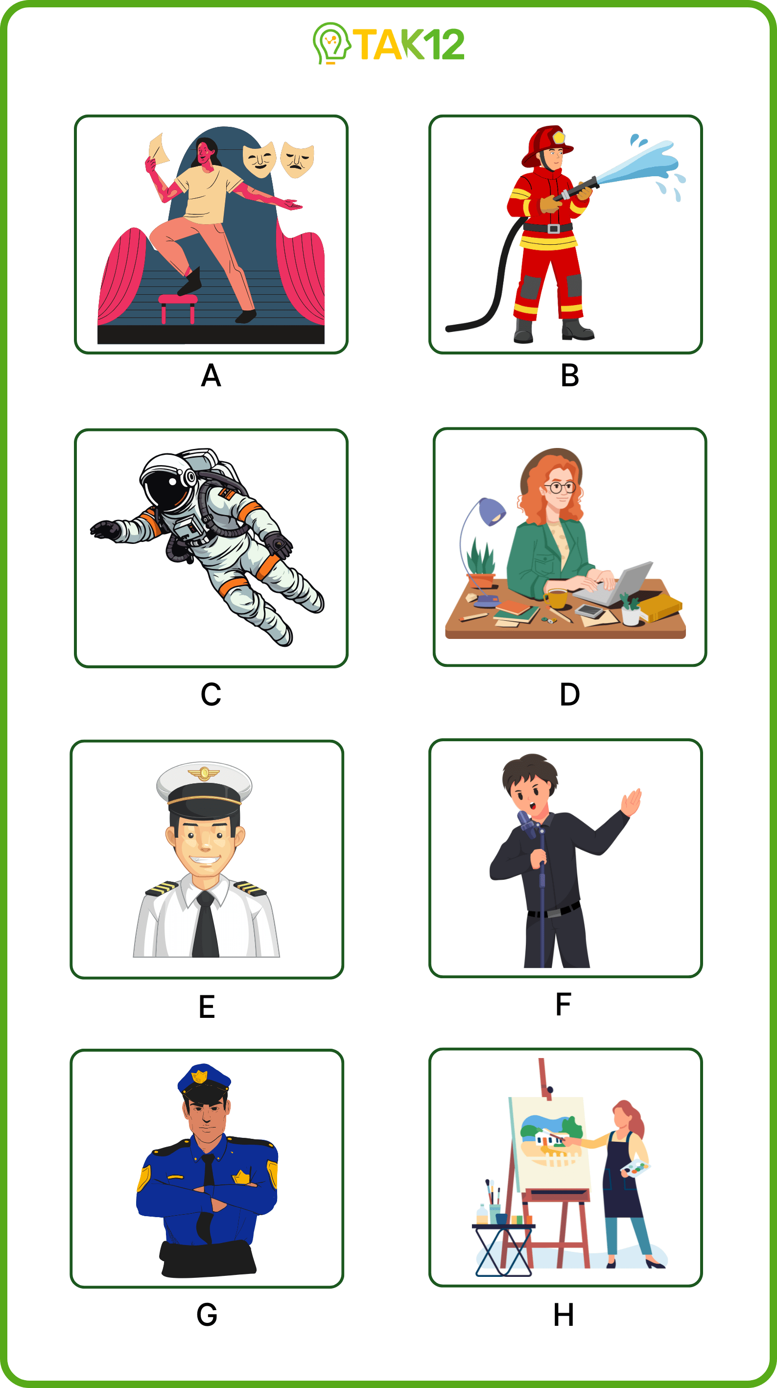 Listen and write a letter in each box. There is one example.