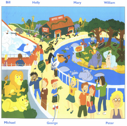 Example: George - the boy wearing a red hat, holding a large green snake.