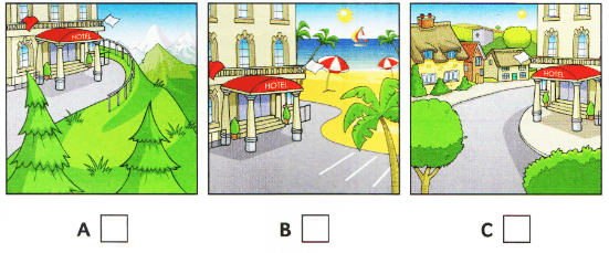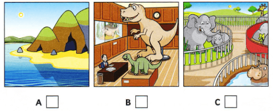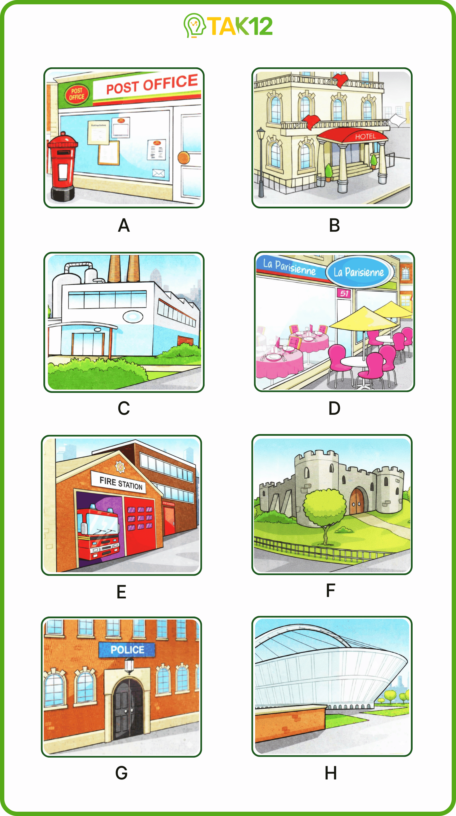 Listen and write a letter in each box. There is one example.