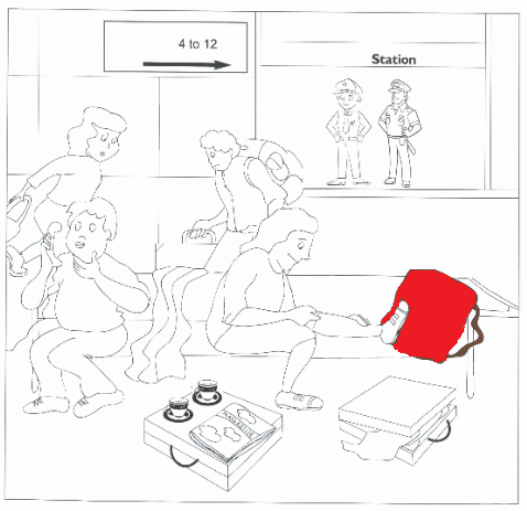 4. Write '' above two police officers next to the man with the rucksack.