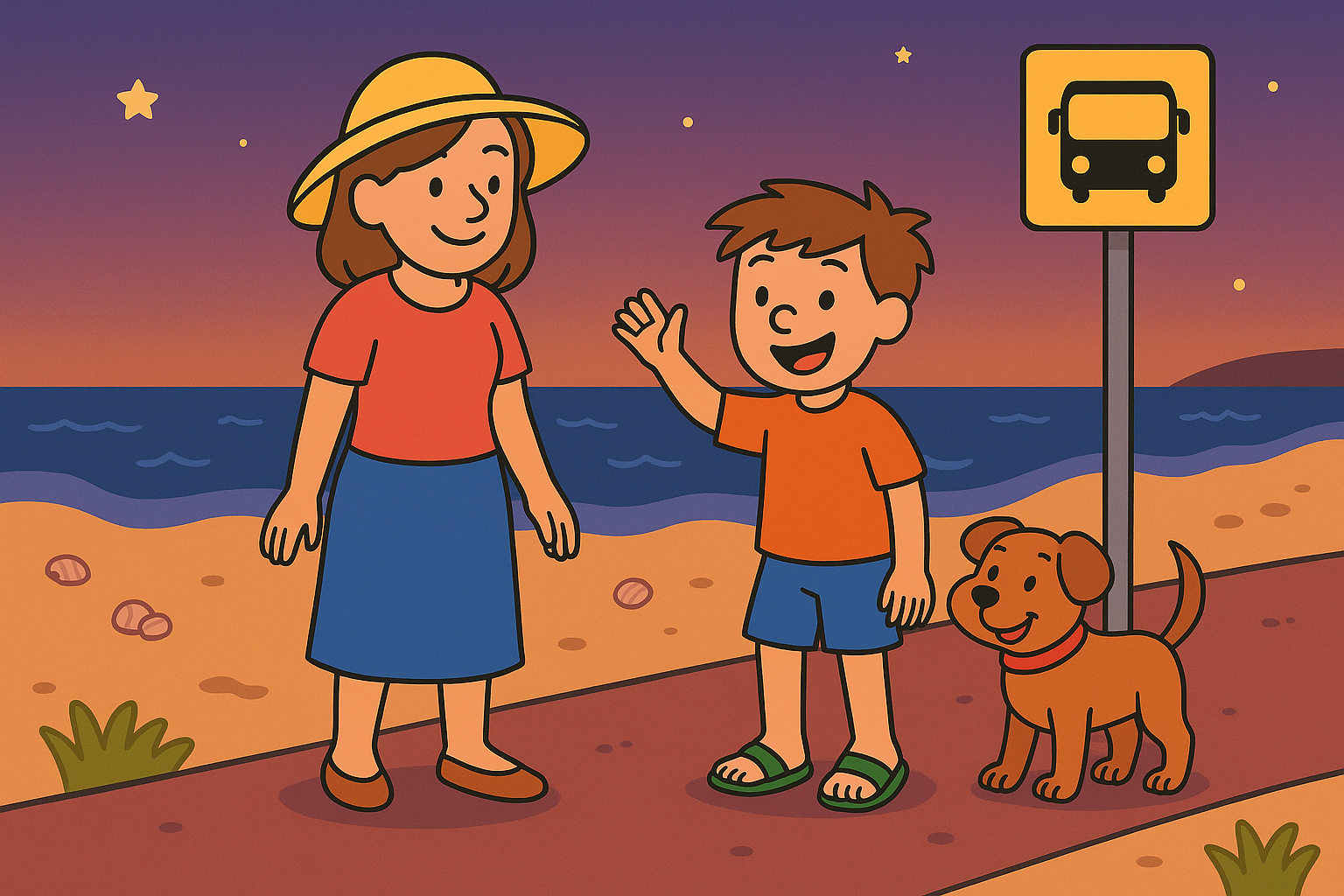 Mum and Tom live in a small town. Last Sunday, they took the bus to the beach.