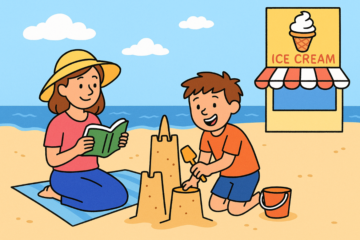 They put their mats on the sand to enjoy. Tom built a tall sandcastle. Mum read a book next to him.