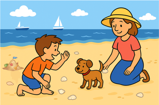 Tom and Mum looked for lots of shells, and took some photos. They watched the boats on the water, too. Then Tom saw a small dog in front of them. When Tom waved at the dog, it ran over and moved its tail.