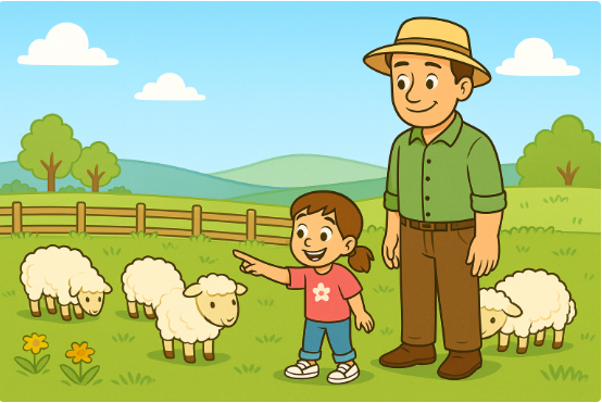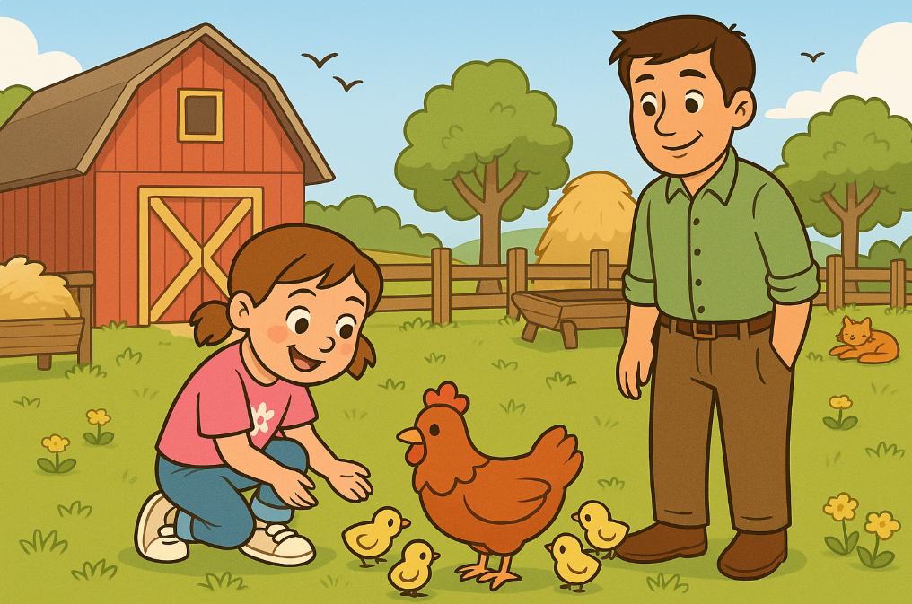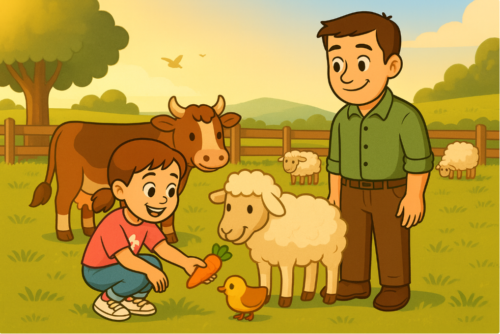 Daisy loves animals. So, one weekend, her dad took her to a farm in the countryside. It was a sunny day.