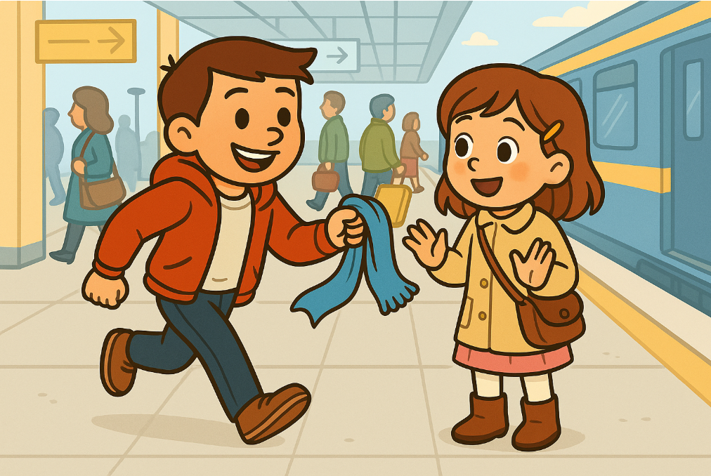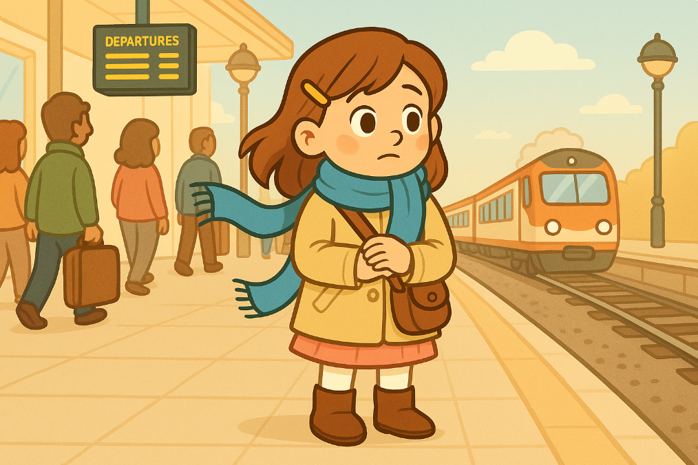 One Saturday morning, Lily was at the train station because she wanted to visit her grandma. She wore her favourite scarf. It was long and blue with white stars on it.