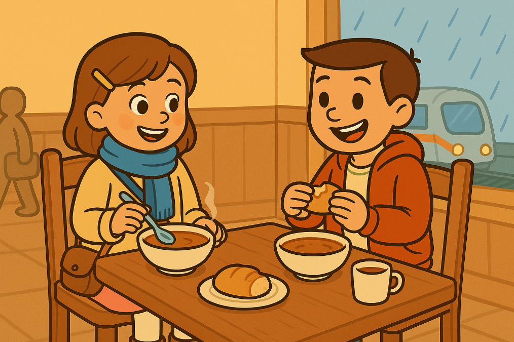 7. At the café, the two new friends ate and warm soup.