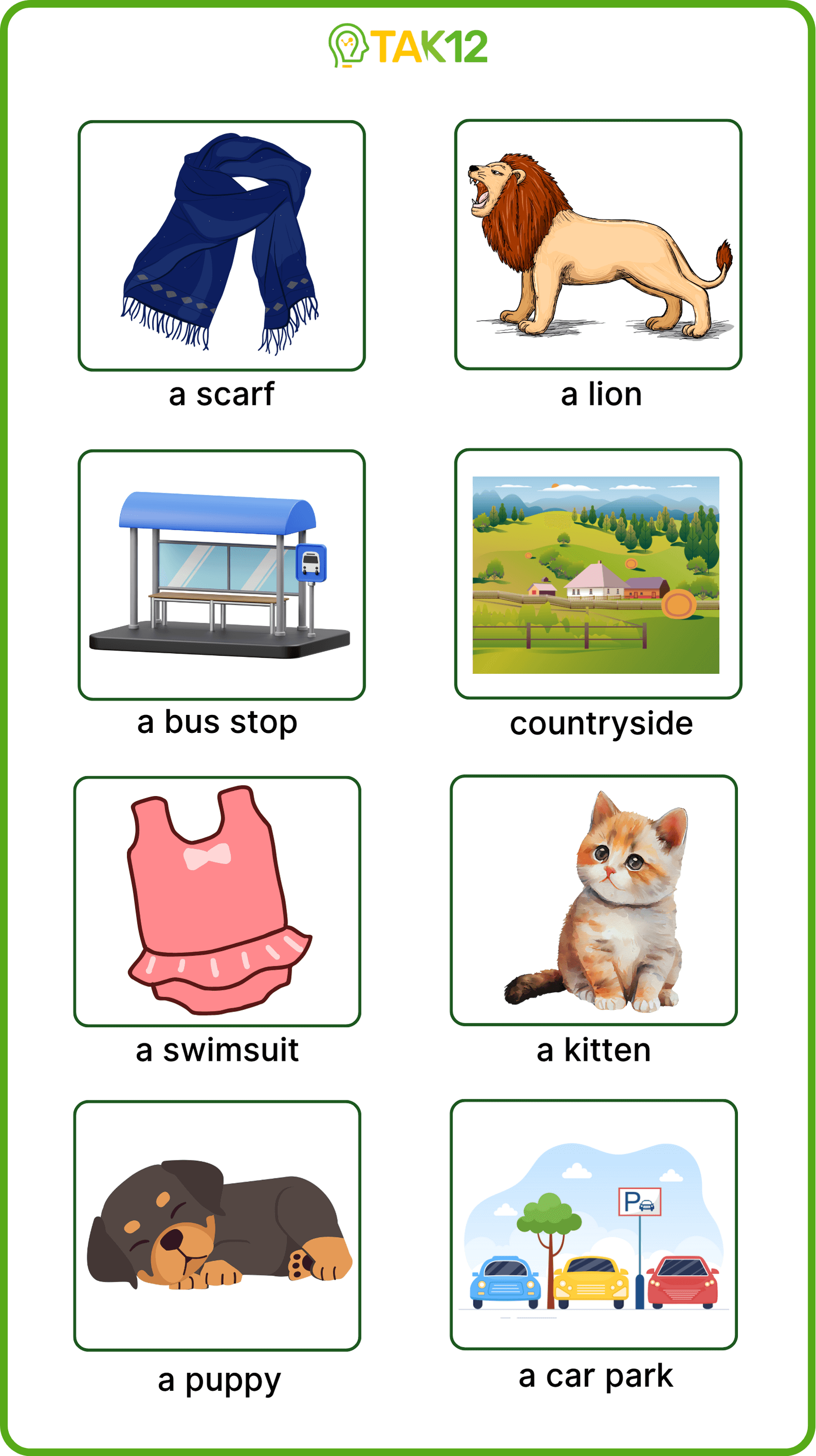 Read the story. Choose a word from the box. Write the correct word next to numbers 1-5. There is one example.