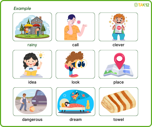 Look and read. Choose the correct words and write them in the blanks. There is one example.