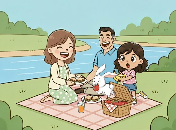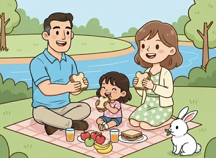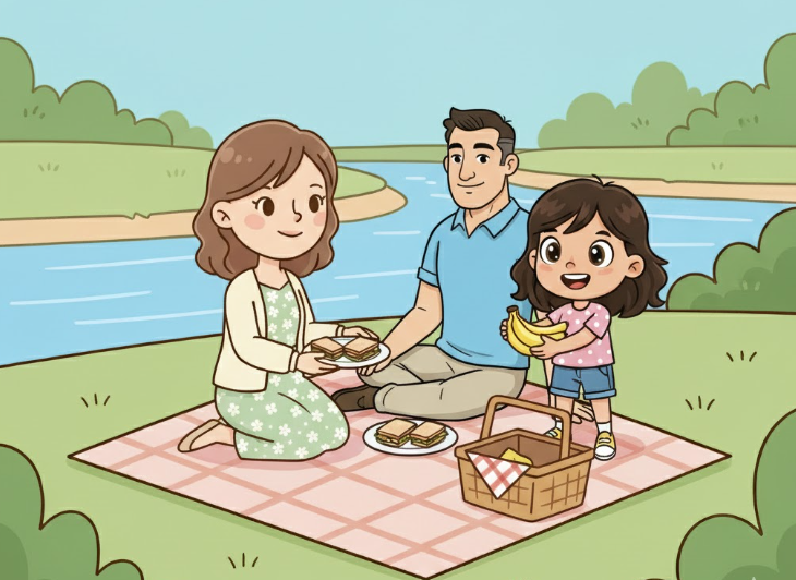 On Sunday, Emma and her family went for a picnic by the river. The weather was sunny and windy. She helped Mum put the blanket on the grass and took out sandwiches and juice. Emma was very happy.