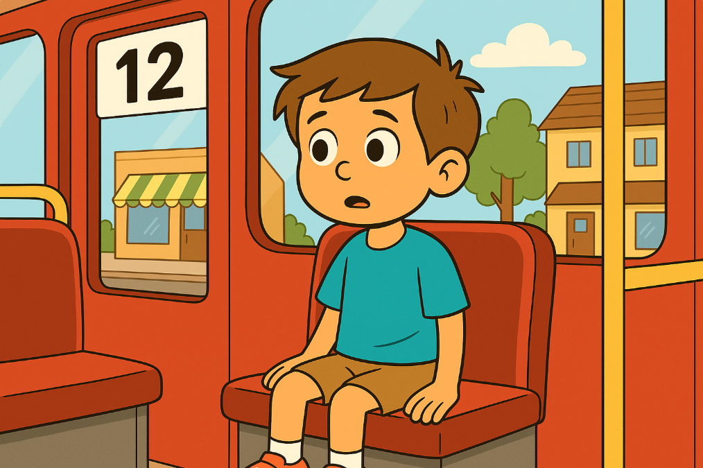 He got on a big, red bus. He sat by the window and looked at all the houses and shops. After a long time, he thought, 'This doesn't look like Sam's street.' He looked at the bus number. It was the number 12 bus!