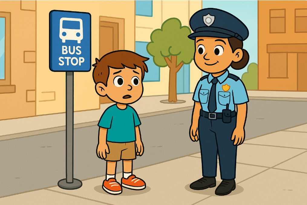 He got off the bus at the next stop. He was in a part of town he didn't know. He felt scared. He looked left and right, but he didn't see anything he knew. Then he saw a police officer.