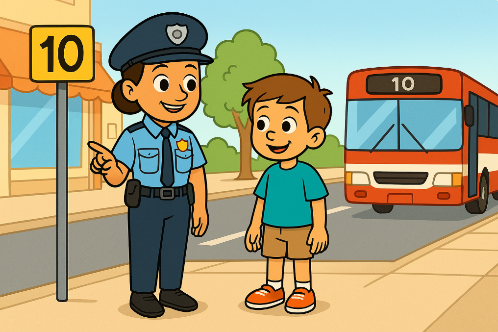Ben said, 'Thank you!'. Then he went across the road to wait for the right bus. Soon, the number 10 bus arrived and he got on. He was very happy and not scared anymore.