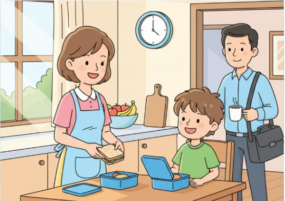 Every morning, Mum made two lunch boxes. She made one for Dad to take to work, and one for her son, Tom, to take to school. Two lunch boxes were blue.