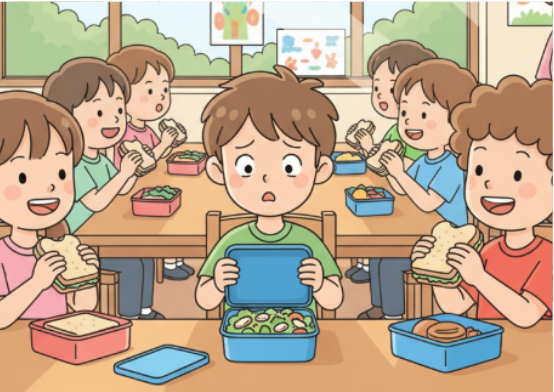 At school, Tom sat down with his friends. He was very hungry and happy to eat his cheese sandwich. He opened his lunch box. But inside, there was no sandwich. There was a big salad with chicken.