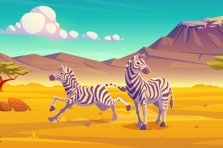 Zebras are like horses, but they are than horses. A zebra's body is black and white. It has got long legs and a tail with long, black hair at the end of . Zebras have got good eyes and ears, so they can see and hear dangerous animals quickly. They are very strong, and they are good running. These animals live in warm places where there is a lot of grass. They eat grass and small plants. They must water every day, so they live near a river or a lake too. When is no rain, they walk to other places to find food.