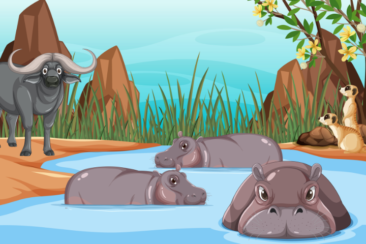 Hippos are very big animals. bodies are grey. They have got small eyes, big mouths and short legs. They live in rivers and lakes in hot countries. Hippos like in the water during the day because it keeps them cool. When the sun goes down, they come out the water. They can walk far from the water to find the food. They eat grass and plants. Hippos can walk under the water, they cannot swim well. Hippos live in groups. A group of hippos can have ten or more. People can see them in books, pictures, or the zoos.