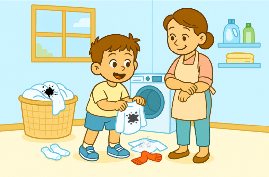 Tom took all the dirty clothes to the washing machine. He put in a white sweater, some white socks, and his white T-shirt. Then, he saw his favourite red scarf on the floor. He put that in the machine, too.