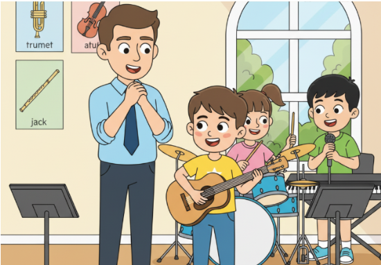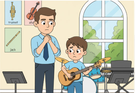 The teacher listened to Jack play. He smiled, 'You play quite well, Jack,' he said. 'But you need to practice more before you can play in the band.'