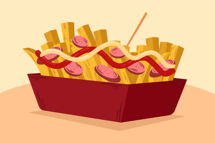 Fries are a very famous food the world. They are long, thin pieces of potato. Fries are usually yellow or brown. People eat fries with other foods. Fries are good with burgers sandwiches. People eat fries with chicken or fish too. Some people eat fries with sauce or cheese. Children often like fries . They eat fries at birthday parties. They have fries when their family goes to restaurants. Fries are easy to at home too. But it is not good to eat every day.