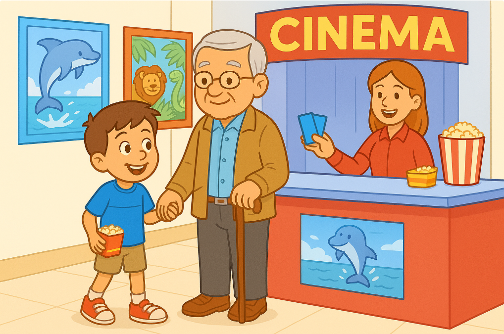 Peter and his grandpa went to the cinema on a Tuesday afternoon. The weather was windy and sunny. Peter was very happy because he loved dolphins.